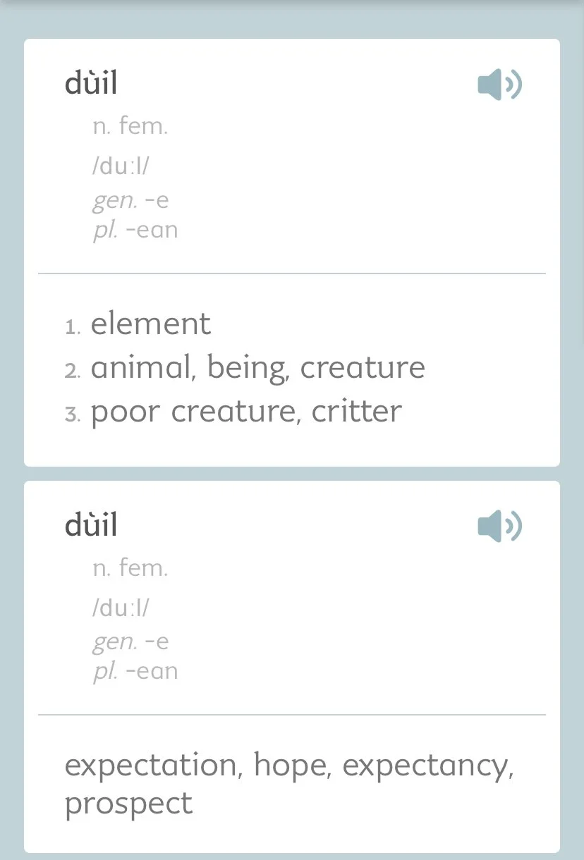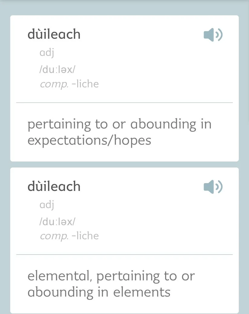 Dùile (pronounced dool) are elements, but they are also ‘expectations’. Dùile hold a sense of hunger, wanting and desire. The dùile exist to satisfy your needs and to lead you further and forward into greater searching; then the dùile satisfy those needs which lead to further seeking.